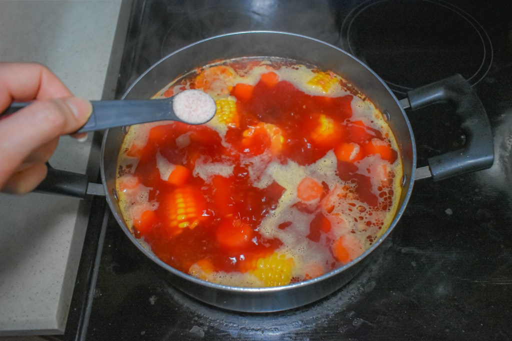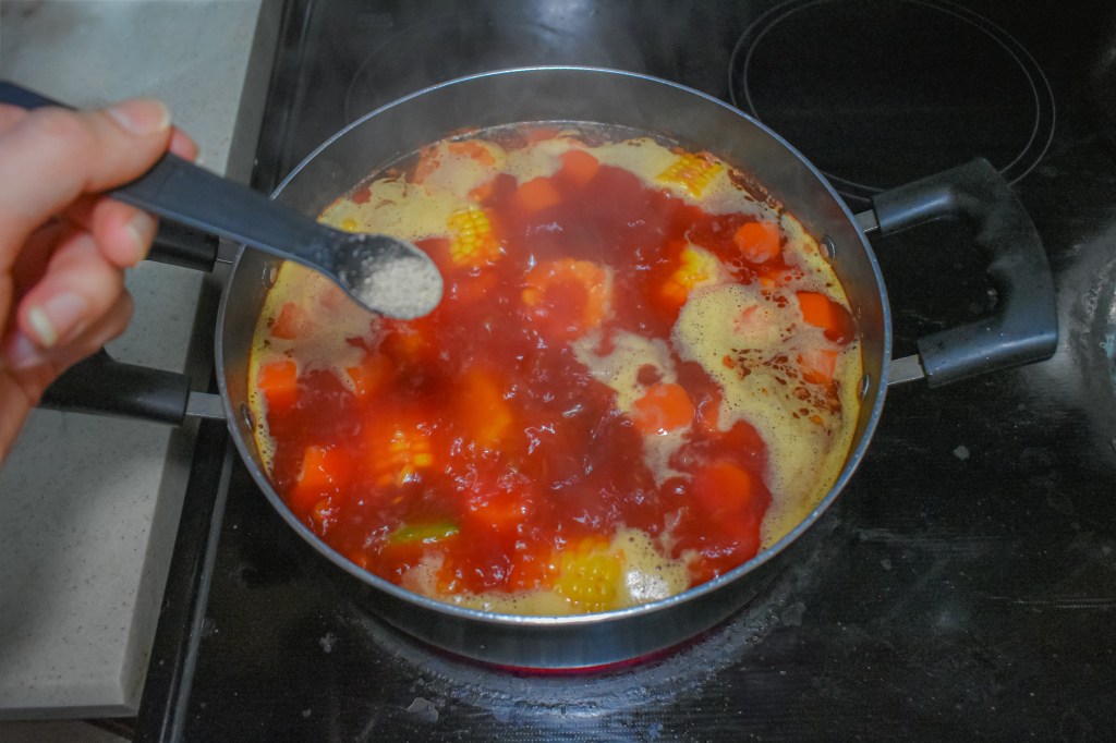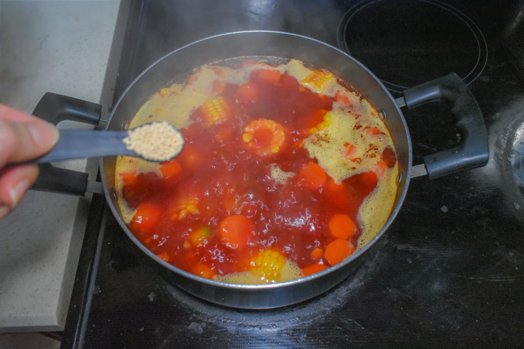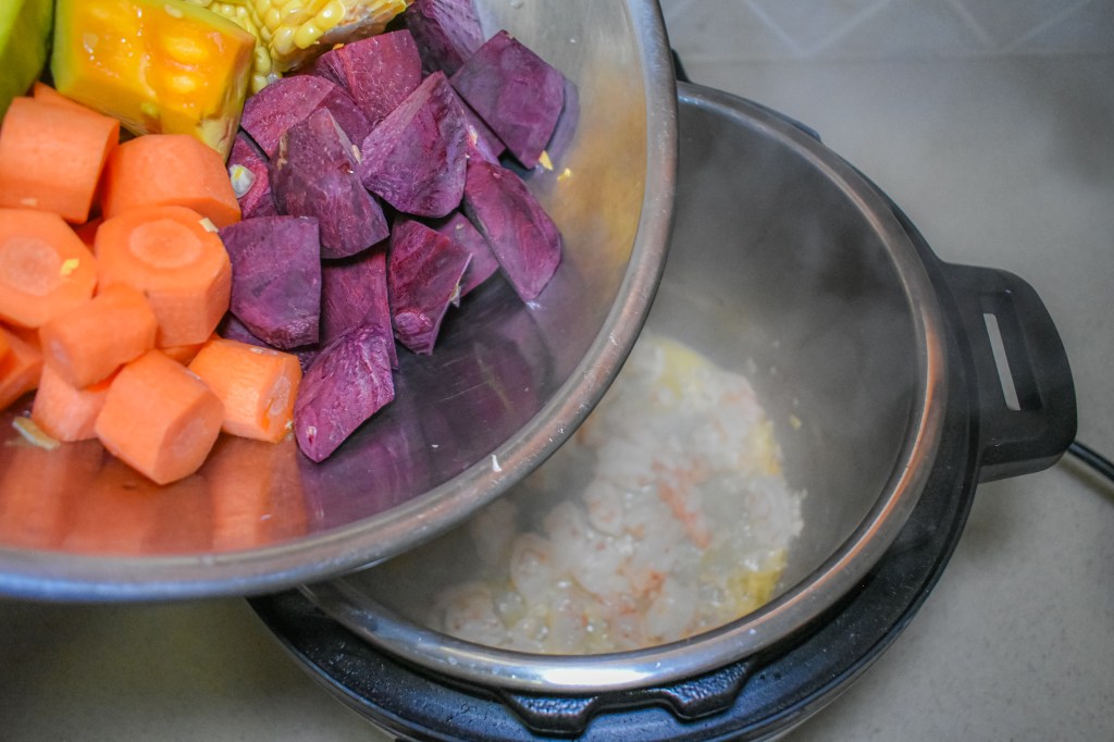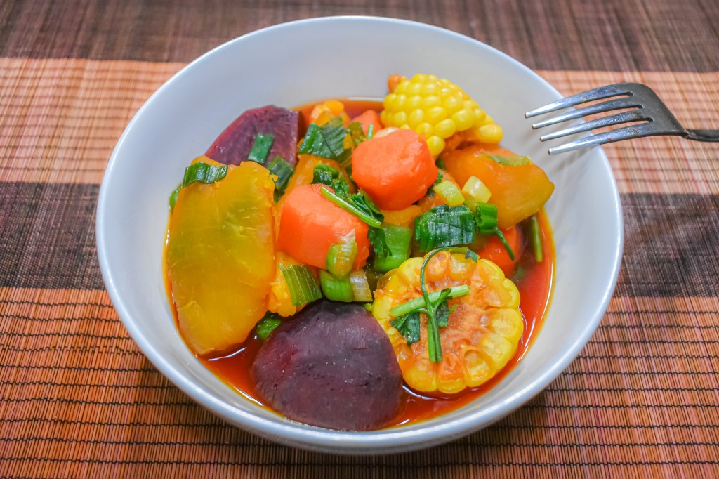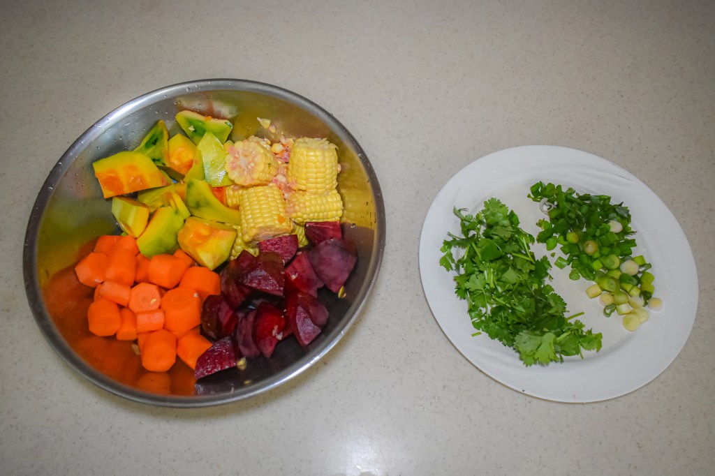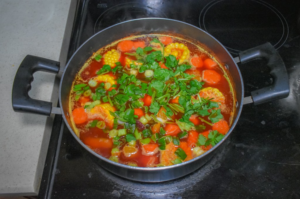 This hearty-filling soup has warm-colored veggies of carrots, beets, kabocha squash/butternut squash/pumpkin, and corns along with shrimp and scallop as protein, topped with chopped green onion and cilantro as a finishing touch.